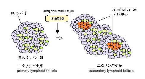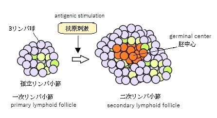 ・胚中心は二次リンパ小節が抗原刺激を受けて活性化された二次リンパ小節だけに見られる。
