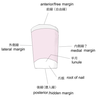 ・whitish: ・gestation:懐胎 ・outline:~の輪郭を描く ・nail matrix:爪母基 ・histologic:組織学的な ・dermis:真皮 ・stratum basale: ・obscure:覆い隠す ・noticeable:目立つ、顕著な ・eponychium:上爪皮 ・assessment:判断 ・malnourishment:栄養不良 ・anemia:貧血詳