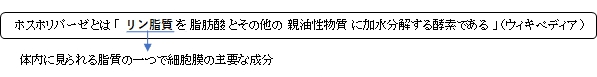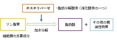 ホスホリパーゼ( 英:phospholipase ) ・概 要 ・分 類 ・参考となるサイト 【概 要】 ⇒消化酵素一覧表 【分 類】 「触媒する反応の種類によりA, B, C, Dの4種に大きく分類される。 」(ウィキペディア) 1 ホスホリパーゼA ホスホリパーゼA1 SN-1アシル基を切断する。 ホスホリパーゼA2 SN-2アシル基を切断し、アラキドン酸を生成す 2 ホスホリパーゼB SN-1とSN-2アシル基を共に切断する。リゾホスホリパーゼ (Lysophospholipase) としても知られる。 3 ホスホリパーゼC リン酸ジエステル結合(グリセロールとの間)を切断し、ジアシルグリセロールとリン酸基を有する頭部を生成する。PLCはセカンドメッセンジャーであるジアシルグリセロールとイノシトールトリスリン酸を放出し、シグナル伝達において重要な役割を果たしている。 4 ホスホリパーゼD リン酸エステル結合を切断し、ホスファチジン酸 (phosphatidic acid) とアルコールを生成する。 【参考となるサイト】 以下は「ウィキペディア」の解説文となる。 ホスホリパーゼ (phospholipase) は、リン脂質を脂肪酸とその他の親油性物質に加水分解する酵素である[1]。 触媒する反応の種類によりA, B, C, Dの4種に大きく分類される。 ホスホリパーゼA (Phospholipase A) ホスホリパーゼA1 (Phospholipase A1) - SN-1アシル基を切断する。 ホスホリパーゼA2 (Phospholipase A2) - SN-2アシル基を切断し、アラキドン酸を生成する。 ホスホリパーゼB (Phospholipase B) - SN-1とSN-2アシル基を共に切断する。リゾホスホリパーゼ (Lysophospholipase) としても知られる。 ホスホリパーゼC (Phospholipase C) - リン酸ジエステル結合(グリセロールとの間)を切断し、ジアシルグリセロールとリン酸基を有する頭部を生成する。PLCはセカンドメッセンジャーであるジアシルグリセロールとイノシトールトリスリン酸を放出し、シグナル伝達において重要な役割を果たしている。 ホスホリパーゼD (Phospholipase D) - リン酸エステル結合を切断し、ホスファチジン酸 (phosphatidic acid) とアルコールを生成する。 C型とD型はホスホジエステラーゼである。 ホスホリパーゼA2は、完全なレシチン分子に対して作用し、2位の脂肪酸エステル結合を加水分解する。生成物は脂肪酸とリゾレシチン (lysolecithin) である。ヘビ毒、ハチ毒(Bee venom)の主成分で哺乳類では膵液中に存在し消化酵素の役割を果たす。