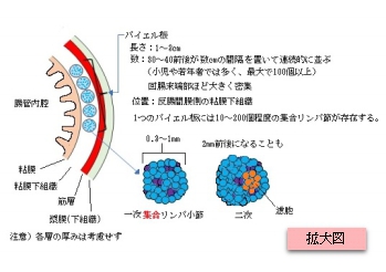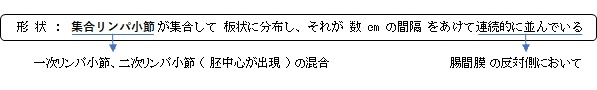 ・1 つのパイエル板に 10〜200 個程度の一次・二次リンパ小節(直径約0.3~1㎜、活性化により2㎜前後まで増大)が集まる。