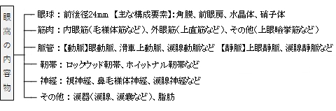 ・cavity: ・appendage:付属物 ・imply:含む ・retrobulbar:眼球後の ・fascia:筋膜 ・exraocular muscles:外眼筋 ・cranial nerves:脳神経 ・lacrimal gland:涙腺 ・sac:嚢 ・duct:輸送管 ・lateral palpebral ligaments:外側眼瞼靭帯 ・suspensory ligament:提靱帯 ・septum:隔膜 ・ciliary ganglion:毛様体神経節 ・short ciliary nerves:短毛様体神経