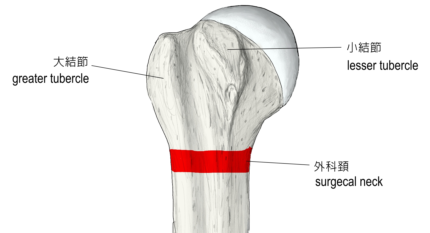 「大・小結節と上腕骨頭のすぐ下方でこの骨の上端が円柱状の部分に移行するところは骨折を起こしやすい場所なので外科頚とよばれる。上腕骨の内側面(やや後方寄り)にはこの外科頚と解剖頚がほぼ一致する場所がある。 」