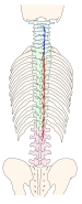 「The Spinalis cervicis (Spinalis colli) is an inconstant muscle, which arises from the lower part of the ligamentum nuchæ, the spinous process of the seventh cervical, and sometimes from the spinous processes of the first and second thoracic vertebræ, and is inserted into the spinosus process of the axis, and occasionally into the spinous processes of the two vertebræ below it.」
