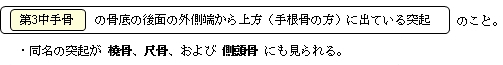 茎状突起(第3中手骨) ( けいじょうとっき、英:styloid process ) 第3中手骨の茎状突起とは 右手首周辺(背側面) 【参考になるサイト】 ・イラストや写真を掲載しているサイト-Ⅰ ・イラストや写真を掲載しているサイト-Ⅱ ・イラストや写真を掲載しているサイト-Ⅲ