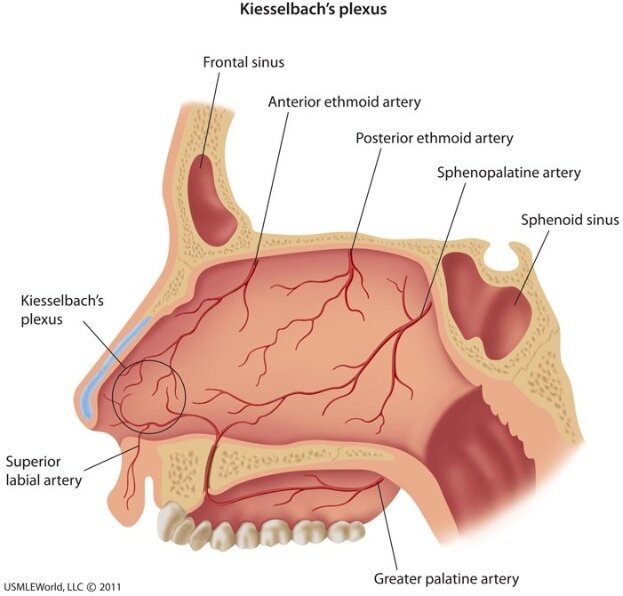 Kiesselbach's plexus is an anastomotic arterial network (plexus) of four or five arteries in the nose supplying the nasal septum. It lies in the anterior inferior part of the septum known as Little's area, Kiesselbach's area, or Kiesselbach's triangle. It is a common site for nosebleeds.