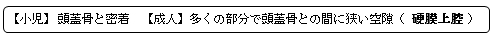 「脳硬膜は、小児では頭蓋骨と密着しているが、成人では頭蓋底および頭蓋の骨が連結する縫合の部位以外は頭蓋骨との間にわずかではあるが狭い腔を作り、これを硬膜上腔という。ここには硬膜を養う血管(中硬膜動脈など)と硬膜への知覚神経が存在している。」「日本人体解剖学 (上巻) 」