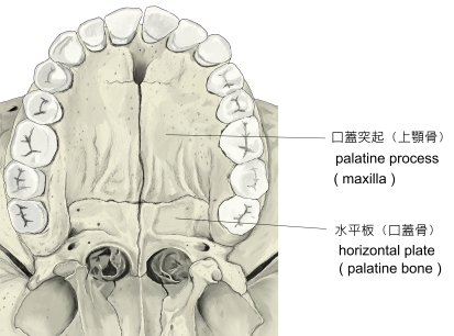 The hard palate is formed by the palatine process of the maxilla and horizontal plate of palatine bone. It forms a partition between the nasal passages and the mouth. On the anterior portion of the hard palate are the plicae, irregular ridges in the mucous membrane that help facilitate the movement of food backward towards the larynx. This partition is continued deeper into the mouth by a fleshy extension called the soft palate.