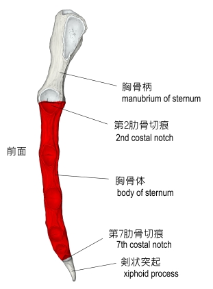 「胸骨柄の下端は胸骨体と結合する。この結合部はかなり長期間軟骨性の結合のままで経過し、ここが骨性の結合となるのは成年以後に成ってからである。したがって若い個体の晒した骨では胸骨柄と胸骨体が分離してしまっている。胸骨体は胸骨柄の約3倍の長さの長方形の部分で、その幅は下方にいくにしたがって徐々に広くなるが、下端では急に狭まっている。その前面は後面に比べればやや凸面に近い。側面は肋軟骨と関節するための6対の切痕がある。 」