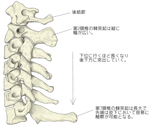 ・第7頚椎の棘突起は長大で通常二分せずに肥厚し、皮下に容易に確認することができる。