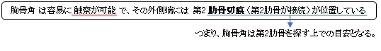 「胸骨柄と胸骨体とが結合する部位は前方に突出し、体表からも触れられる。これを胸骨角といい、胸骨角には第2肋骨がつく。第1肋骨は体表から触れることができないため、臨床的にはこの第2肋骨が目安となる。胸骨角は一般には鈍角であるが虚弱者では鋭角となる場合がある。」