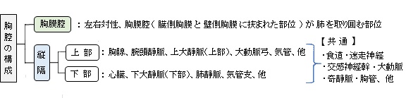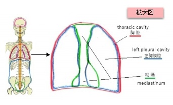 胸 腔( きょうくう、英:thoracic cavity ) 以下は体腔を簡単に記した全体図となる。 【参考になるサイト】 ・イラストや写真を掲載しているサイト-Ⅰ ・イラストや写真を掲載しているサイト-Ⅱ ・イラストや写真を掲載しているサイト-Ⅲ