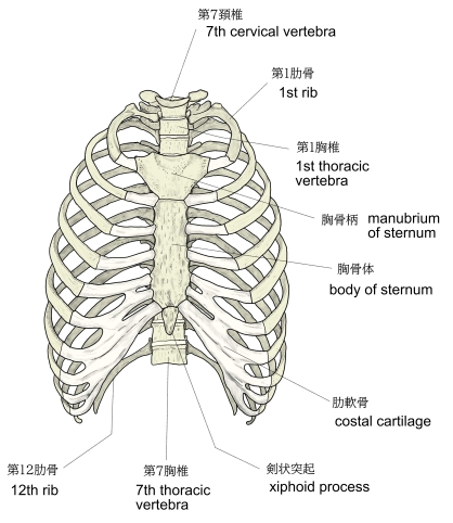 「胸郭は、胸椎(12個)、肋骨(12対)および胸骨(1個)によって構成される。胸郭の上方は第1肋骨,胸骨および第1胸椎とによって境され、胸郭上口をつくる。下方は、胸郭下口 といい、胸骨の剣状突起、第7~第10肋軟骨、第11・第12肋骨および第12胸椎体の下縁によって囲まれる。第8~第10肋軟骨は合して、全体として下方に向かう膨隆した弓状縁をつくる。これを肋骨弓と言い、左右の肋骨弓は胸骨の下端で剣状突起を挟んで合し、約70度の角をなす。これを胸骨下角という。各肋骨間の間膜を肋骨隙といい、その数は11ある。間隙の広さは、上方から下方に行くにつれて狭く、後方よりも前方が広く、ことに肋骨と肋軟骨が接合する付近においては最も広い。 」