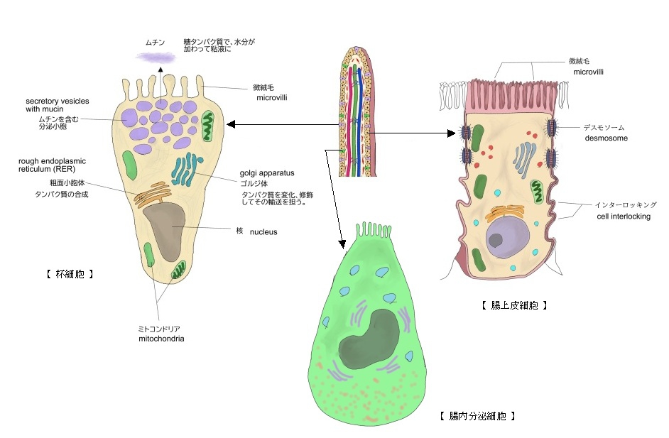 A:「空腸と回腸では腸管吸収上皮細胞の構造や機能にいくつか違いがあります。基本的には同じ種類の細胞ですが、栄養吸収や免疫機能への適応によって特徴が変わっています。