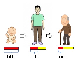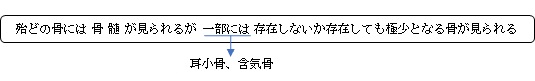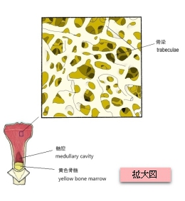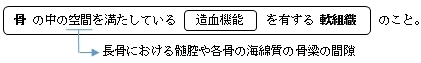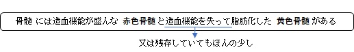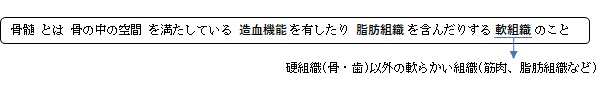 骨 髄( こつずい、英:bone marrow ) ・概 要 ・種 類 (赤色骨髄、黄色骨髄) ・構 成 ・イラスト掲載サイト 【概 要】 骨の空間 ⇒ 長骨における髄腔や扁平骨などの海綿質の骨梁の間隙 ・耳小骨 : ツチ骨、キヌタ骨、アブミ骨、非常に小さく骨密度が高い。 ・含気骨 : 蝶形骨や上顎骨などの空気を含む骨。空気を含むための空洞で占められる。 血球の種類 寿 命 1日あたりの産生量の目安 備 考 1 赤血球 約120日 約2~3兆個 寿命が長めなので1日の産生量は膨大だが、白血球より安定的 2 血小板 約7〜10日 約1兆個 寿命が短いため、毎日大量に補充される 3 好中球 数時間〜数日 約1000億個 寿命が非常に短いため、骨髄での産生は非常に活発 4 単球/リンパ球 数日〜数年 数億〜数十億個 種類によって寿命や産生頻度に差がある ■ 種 類 ■ 骨髄には、造血機能を営んで赤色を呈している赤色骨髄と、脂肪化して造血機能を停止し黄色を呈している黄色骨髄の2種類がある。 出生後の骨髄はほとんどが赤色骨髄だが、年齢を重ねるにつれて段々と黄色骨髄の割合が増えていく。 1 赤色骨髄 red (bone) marrow 造血機能を盛んに営んでいる骨髄で、胎児や新生児の骨髄はほとんどがこの赤色骨髄。しかし、加齢ととも少しずつ黄色骨髄に置き換わっていく。成人になっても赤色骨髄を有する骨は以下になり、椎骨を除いてはほとんどが扁平骨 体幹部)胸骨、脊椎、肋骨、寛骨 頭 部)頭頂骨、前頭骨、側頭骨、後頭骨 ※大腿骨や上腕骨などでも、近位端の骨端部など限られた場所には成人になっても赤色骨髄が存在する。 2 黄色骨髄 yellow (bone) marrow 赤色骨髄が脂肪化し、造血機能を停止してしまったもの。加齢とともに四肢の骨髄の造血機能がだんだん失われ黄色骨髄となっていく。 ■ 構 成 ■ ※一部、正確性に欠ける可能性有! 1 血液細胞 blood cell 造血幹細胞や分化過程中にある各種の細胞 2 間質細胞 stromal cell 間葉系由来の細胞で、骨細胞、軟骨細胞、脂肪細胞などさまざまな細胞に分化する。血液細胞を支持している。 3 脂 肪 fat 胎生期や乳児期にはほとんどこの脂肪は見られないが、成長するに従ってその割合は増えてくる。 【参考にしたサイト】 ・骨髄の細胞組織学的写真を掲載しているサイトⅠ(日本語の解説有) ・骨髄の細胞組織学的写真を掲載しているサイトⅡ ・骨髄の細胞組織学的写真を掲載しているサイトⅢ ・細胞組織学的解説動画(YouTube)Ⅰ ・細胞組織学的解説動画(YouTube)Ⅱ