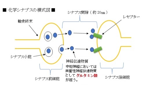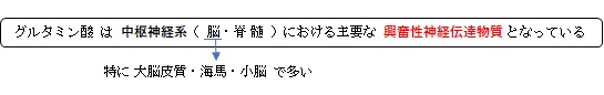 ・中枢神経系において興奮性神経伝達物質はグルタミン酸以外(アスパラギン酸、アセチルコリンなど)にないこともないが、独立した主要伝達物質とは扱われないようである。