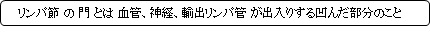 門(リンパ節)( もん、英:hilum ) ・神経:入る 動脈:入る 静脈:出る 輸出リンパ管:出る ・門そのものは被膜の一部が連続した構造となる。よって、血管・神経は門で被膜を貫通する。 【リンパの流れ】 1. 輸入リンパ管がリンパ節の凸側(被膜)から侵入 2. 「被膜下洞 → 皮質洞 → 髄洞」 の順にリンパがリンパ節内を流れる。 3. いくつかの髄洞が集まって輸出リンパ管を形成し門からリンパ節を出る。