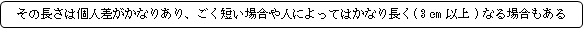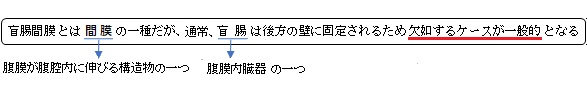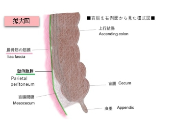 盲腸間膜( もうちょうかんまく、英:mesocecum ) 以下「Google AI」調べとなる。 通常 : 存在する場合、1~2㎝程度であることが多い。 短い場合 : 数㎜程度 長い場合 : 3㎝以上の場合、日本人の約15~30%程度に見られる。 ⇒ 移動性盲腸の素因となる。