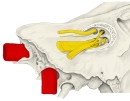 It is closed by a vertical plate, which is divided by a horizontal crest, the transverse crest (falcifom crest, crista falciformis), into two unequal portions. Each portion is further subdivided by a vertical ridge into an anterior and a posterior part. In the portion beneath the crista falciformis are three sets of foramina; one group, just below the posterior part of the crest, situated in the inferior vestibular area (area cribosa media), consists of several small openings for the nerves to the saccule; below and behind this area is the foramen singulare, or opening for the nerve to the posterior semicircular duct; in front of and below the first is the tractus spiralis foraminosus, consisting of a number of small spirally arranged openings, which encircle the canalis centralis cochleæ; these openings together with this central canal transmit the nerves to the cochlea. The portion above the transverse crest presents behind, the superior vestibular area (area cribrosa superior), pierced by a series of small openings, for the passage of the nerves to the utricle and the superior and lateral semicircular ducts, and, in front, the facial area (area facians), with one large opening, the commencement of the canal for the facial nerve (aquæductus Fallopii). 」