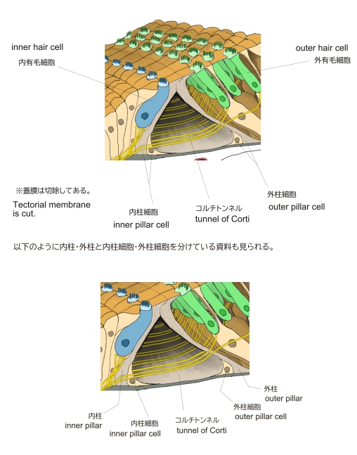 「 これ(柱細胞)には内柱Innenpfeilerと外柱Außenpfeilerとがある.柱という名前であるが,いずれも細胞と同格めものであって,細胞体の一部が剛い靱帯様の構造すなわち柱Pfeilerになっているのである.また細胞体のうちでこのような変化を示さない部分は薄い層をなして柱を被い,基底部ではそれがとくに多く集まって核をつつんでいる.基底部に集積したこの原形質の部分は床細胞Bodenzelleともよばれる.内柱は神経孔のすぐ外方で基底板の前庭階面に突出し,蝸牛管の全長を貫いて1列にならんでいる.内柱は垂直に立っているのではなく,その上端が外方へ傾いている.内柱から少し離れたところで基底板上にある外柱もやはり斜めに出ているが,これは内方へ傾いて,その上端をもって内柱に寄りかかつている.かくして内外の両柱はラセン弓Arcus spiralisとよばれるアーチをつくり,トンネルTunnelraumという三角形の空所を橋わたして囲むのである.