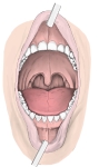 「 軟口蓋は粘膜のつくる大きなひだで,内部に筋肉をもち,口腔と咽頭腔とのあいだの不完全な隔壁をなしている.軟口蓋は硬口蓋の後縁から後下方にのびていて,その中央部に口蓋垂 ( Uvula palatina ) という箸しくのびたところがある.両側へ向かって軟口蓋から各側2つの弓形をしたひだが下方へすすんでいる.」