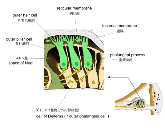 ヌエル腔( ぬえるくう、英:space of Nuel ) ・コルチトンネルの隣り(外側)に位置している。 ・「ACOUSTICAL SOCIETY」の解説文には「Fluid-filled space」とあるので、蝸牛管同様、内リンパで満たされていると思ったが、 新潟大学医学部のサイトの「内耳のしくみ」の解説文に以下のような説明を発見。 「感覚細胞である有毛細胞は、感覚毛が分布する頂上膜のみを内リンパ液に、細胞体を外リンパ液に浸しています。」 外有毛細胞周辺 蝸牛ラセン管 以下は「ACOUSTICAL SOCIETY」の解説文となる。 Fluid-filled space between the outer rods of Corti and the inner row of the outer hair cells, extending the length of the organ of Corti from base to apex. ■ 写真やイラストを掲載しているサイト ■ ・ イラストや写真を掲載しているサイト-Ⅰ ・ イラストや写真を掲載しているサイト-Ⅱ ・ イラストや写真を掲載しているサイト-Ⅲ ・ イラストや写真を掲載しているサイト-Ⅳ