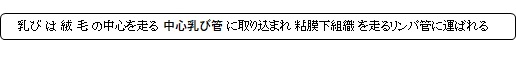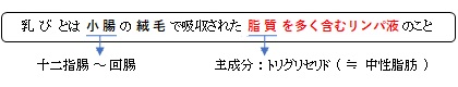 乳 び( にゅうび、英:chyle ) ・乳びは脂質の割合(30~60%)が多いので、その色は白色~乳白色となる。 以下は乳びの流れを簡単に表した図となる。 【ChatGPTに聞いてみた】 Q:「乳びは通常のリンパ液に比べてどのくらい脂質が多いのか?また、その脂質の種類は?」 A:「通常のリンパ液の脂質の割合は0.1~1%程度、それに対して乳びは30~60%となる。(特に食後に多く白く濁る) 【乳び中の脂質の標準的な組成(食後の場合)】 脂質の種類 割 合(%) 説 明 1 トリグリセリド 約 85〜95% 乳びの主成分。小腸で吸収された長鎖脂肪酸から形成される。 2 リン脂質 約 4〜10% 細胞膜成分や乳びの微粒子の構造維持に関与 3 コレステロール 約 1〜3% 血中コレステロールや細胞膜の材料として重要 4 遊離脂肪酸 1%未満 トリグリセリドから部分的に遊離した脂肪酸
