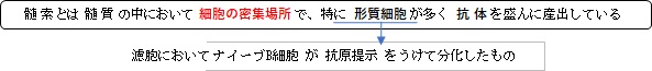 胚中心で活性化されたB細胞やメモリーB細胞が含まれる。形質細胞ほど多くはないが髄索に存在。 |