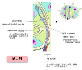 ・血管 : 門から入った血管は髄質(髄索髄洞は血管の通り道にはならない)を通った後は梁柱(の内部の結合組織を通る)に入って外側へ向かう。
