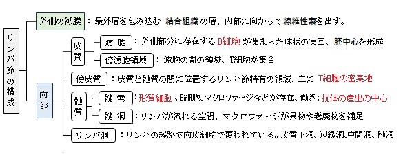リンパ節は大きく最外側あたる被膜とその内部構造に分けることができる。そして内部構造はさらにいくつかの部位に分かれる。