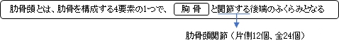 「肋骨頭は肋硬骨の後端のふくらみで、ここには胸椎椎体(の肋骨窩)と関節する関節面(肋骨頭関節面)がある。この関節面は第2~10肋骨ではクサビ状の立体形をしている。肋骨頭から3cm足らず離れたところに肋骨結節という楕円形の高まりが後方に突出している。この結節の表面には胸椎の横突起(の横突肋骨窩)と関節する関節面(肋骨結節関節面)がる。」