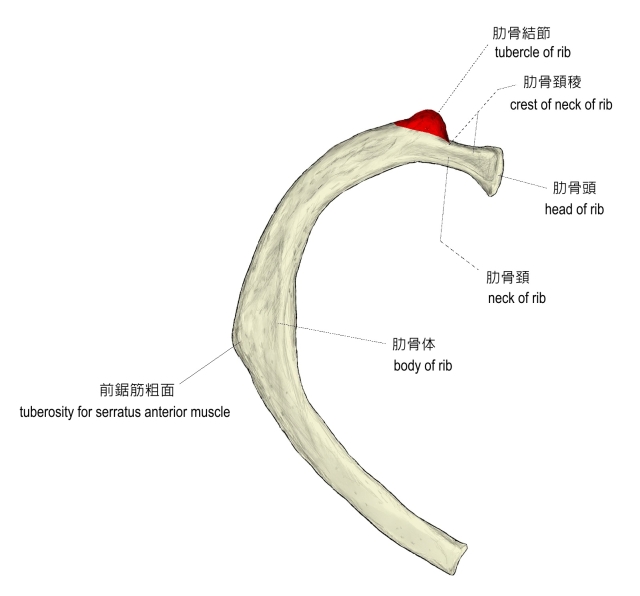肋骨結節(肋骨) ( ろっこつけっせつ、英:tubercle of rib ) 肋骨結節とは 「THE FREE DICTIONARY」では以下のように解説している。 「the knob on the posterior surface of a rib, at the junction of its neck and shaft, which articulates with the transverse process of the vertebra, which corresponds in number to the rib, forming a costotransverse joint.」 右第2肋骨(上面) 右第5肋骨(上面) 右肋骨(上面) 第6肋骨 第8胸椎・第8肋骨 【参考になるサイト】 ・イラストや写真を掲載しているサイト-Ⅰ ・イラストや写真を掲載しているサイト-Ⅱ ・イラストや写真を掲載しているサイト-Ⅲ ・イラストや写真を掲載しているサイト-Ⅳ
