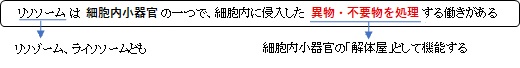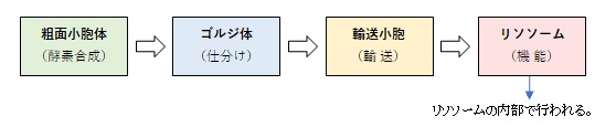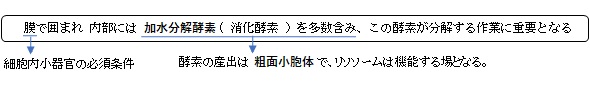 リソソーム( lysosome ) ・大きさは資料によって幅があり「ウィキペディア」では「直径は0.4~5マイクロメートルほど。」としている。 ■酵素の種類■ 参考:「ChatGPT」 ・タンパク質分解(カテプシンB/D/L) ・核酸分解(DNase Ⅱ、RNase) ・脂質分解(酸性リパーゼ、ホスホリパーゼAz) ・糖鎖分解(β-ガラクトシダーゼ、α-マンノシダーゼ、ヘキソサミニダーゼ)など。 ■分解されるもの■ ・古くなったタンパク質 ・使い終わった細胞内小器官(ミトコンドリアなど) ・取り込まれた細菌・ウイルス ・外から取り込んだ物質(エンドサイトーシス産物) ■分解後■ 一部は排出され、一部はアミノ酸・糖・脂肪酸 などにして再利用 【他の参考になるサイト】 ・生成過程がなんとなく分かるイラストを掲載しているサイト① ・生成過程がなんとなく分かるイラストを掲載しているサイト② ・構造が分かるイラストを掲載しているサイト