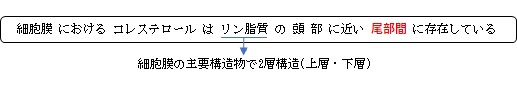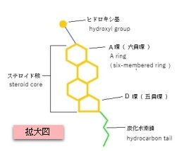 ・ヒドロキシ基 : 親水性、リン脂質の頭部付近と相互作用、コレステロールの位置を固定するアンカー役
