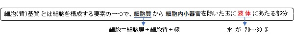 細胞(質)基質( さいぼう(しつ)きしつ、英:cytosol ) ・概 要 ・構成要素一覧 【概 要】 【構成要素一覧(概算)】 構成要素 割合(目安) 内容・例 1 水 70〜80 % 溶媒。拡散・反応の場 2 タンパク質 15〜25 % 代謝酵素、構造タンパク質、シグナル分子 3 低分子代謝物 2〜5 % 糖(グルコース)、アミノ酸、脂肪酸中間体など 4 無機イオン 1〜2 % K⁺, Na⁺, Mg²⁺, Ca²⁺, Cl⁻, リン酸 5 核酸関連分子 <1 % mRNA、tRNA、遊離ヌクレオチド 6 補因子・補酵素 <1 % ATP/ADP、NAD⁺/NADH、FAD、CoA など 7 その他 微 量 ビタミン、小分子シグナル、金属イオン