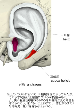 In the lower part of the helix the cartilage is prolonged downward as a tail-like process, the cauda helicis; this is separated from the antihelix by a fissure, the fissura antitragohelicina.
