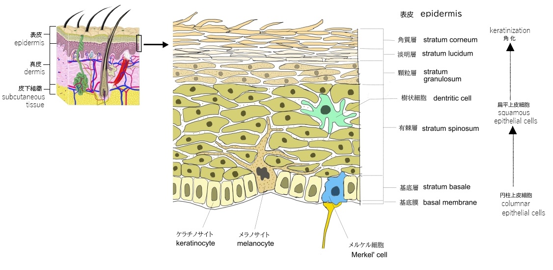 ・皮膚:重層扁平上皮(角化)、機能)保護