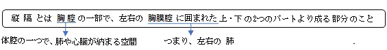 前方)胸骨 後方)胸椎 上方)胸郭上口 下方)横隔膜 左右)肺の縦隔胸膜