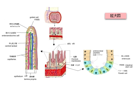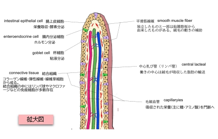 絨 毛(小腸)( じゅうもう、英:villi ) ・概 要 ・上皮の構成 ・固有層の構成 ・参考となるサイト 【概 要】 ・十二指腸、空腸、回腸の小腸全体に分布している。 ・直径は「ChatGPT」によると0.1~0.2㎜ほど。 【部位による違い】 特 徴 1 十二指腸 比較的低く、密度もやや疎 2 空 腸 最も発達し、密度も高い 3 回 腸 やや低くなり、末端ではかなり短い 【上皮の構成】 【固有層の構成】 1. 結合組織(疎性結合組織) ・コラーゲン線維・弾性線維・線維芽細胞などから成り、上皮を支持する基盤の役割を担います。 ・多くの毛細血管・リンパ管が走行しています。 2. 血管・リンパ管 ・毛細血管網 : 吸収された栄養(主に糖・アミノ酸)を門脈へ運びます。 ・中心乳び管 : 脂質(キロミクロン)をリンパ系へ運びます。 3. 免疫系構造 リンパ球・形質細胞・マクロファージなどの免疫細胞が多数存在。 特に小腸では以下が見られます: 孤立リンパ小節 パイエル板:回腸に多いリンパ小節の集合体 4. 上皮のくぼみ(腸腺/リーベルキューン腺) 絨毛の間にあるくぼみで、実際には粘膜固有層内に深く陥入しています。 パネート細胞、杯細胞、幹細胞などが存在し、粘液分泌や上皮再生に関与します。 5. 滑平筋線維 独立した存在のものと、一部は粘膜筋板から絨毛内へ伸びる筋線維で、絨毛の動きを助けます。 ■ 写真やイラストを掲載しているサイト ■ ・ イラストや写真を掲載しているサイト-Ⅰ ・ イラストや写真を掲載しているサイト-Ⅱ ・ イラストや写真を掲載しているサイト-Ⅲ ・ イラストや写真を掲載しているサイト-Ⅳ ・ イラストや写真を掲載しているサイト-Ⅴ