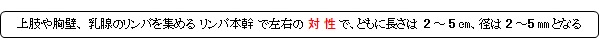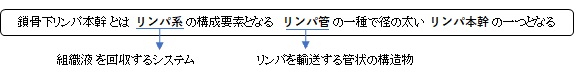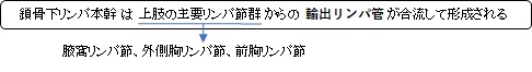 鎖骨下リンパ本幹( さこつかりんぱほんかん、英:subclavian lymphatic trunk ) ・概 要 ・イラスト掲載サイト 【概 要】 ・他のリンパ本幹と同様に3層構造で数対の弁を有する。 ・右鎖骨下リンパ本幹 : 右上肢・右胸部の一部・右乳腺のリンパを集め右静脈角に注ぐ。 ・左鎖骨下リンパ本幹 : 左上肢・左胸壁・左乳腺からのリンパを集め左静脈角に注ぐ。 リンパ本幹-1 体幹のリンパ管 リンパ本幹 -2 ■ 写真やイラストを掲載しているサイト ■ ・ イラストや写真を掲載しているサイト-Ⅰ ・ イラストや写真を掲載しているサイト-Ⅱ ・ イラストや写真を掲載しているサイト-Ⅲ