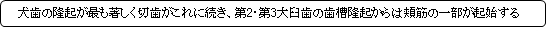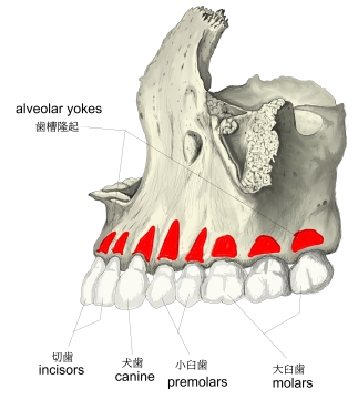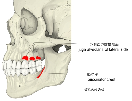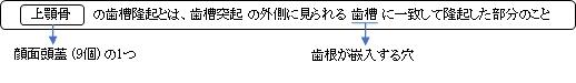 歯槽隆起(上顎骨) ( しそうりゅうき、 英:alveolar yokes ) ・下顎骨にも同じ名称の部位がある。 以下は「船戸和也のHP」の解説文となる。 「歯槽は歯槽突起の外面に歯槽隆起(第2、第3大臼歯の歯槽隆起から頬筋の一部が起こる)をつくり、犬歯で最も著しく、切歯がこれにつづく。」 ■ 写真やイラストを掲載しているサイト ■ ・ イラストや写真を掲載しているサイト-Ⅰ ・ イラストや写真を掲載しているサイト-Ⅱ ・ イラストや写真を掲載しているサイト-Ⅲ ・ イラストや写真を掲載しているサイト-Ⅳ