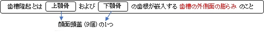 歯槽隆起 ( しそうりゅうき、 英:alveolar yokes ) ・「犬歯で最も著しく、切歯がこれにつづく」(船戸和也のHP) 「 船戸和弥のHP 」では以下のように解説している。 「歯槽は歯槽突起の外面に歯槽隆起(第2、第3大臼歯の歯槽隆起から頬筋の一部が起こる)をつくり、犬歯で最も著しく、切歯がこれにつづく。」 また、以下は「Medical Dictionary.com」の解説文となる。 one of the eminences on the outer surface of the alveolar process of the maxilla or mandible, formed by the roots incisor teeth 【 語 句 】 ・eminence: ・alveolar process: ・maxilla: ・mandible: ・incisor teeth: ■ 写真やイラストを掲載しているサイト ■ ・ イラストや写真を掲載しているサイト-Ⅰ(下顎骨) ・ イラストや写真を掲載しているサイト-Ⅱ(下顎骨) ・ イラストや写真を掲載しているサイト-Ⅲ(上顎骨) ・ イラストや写真を掲載しているサイト-Ⅳ(上顎骨)