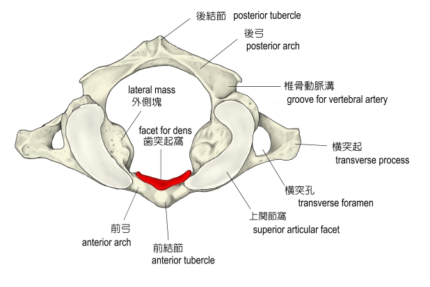 歯突起窩(環椎) ( しとっきか、英:facet for dens ) 歯突起窩とは 以下は「THE FREE DICTIONARY」の解説文となる。 「A rounded facet on the posterior surface of the anterior arch of atlas, which articulates with the dens of the axis in the atlanto-axial joint」 【参考になるサイト】 ・イラストや写真を掲載しているサイト-Ⅰ ・イラストや写真を掲載しているサイト-Ⅱ ・イラストや写真を掲載しているサイト-Ⅲ ・イラストや写真を掲載しているサイト-Ⅳ