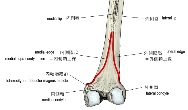 内側顆上線と呼ばれ、外側顆上線ほど顕著ではない(特に上部)。内転筋結節の直下まで達している。 |