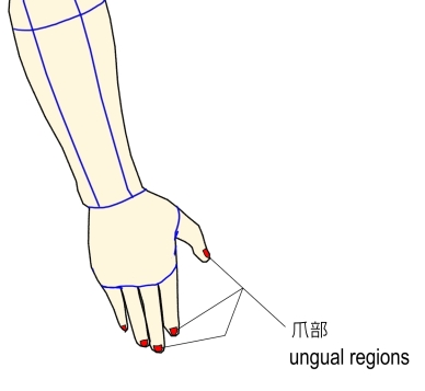 爪部(手)(人体の区分) ( そうぶ、英:ungual region ) 爪部とは このサイトでは人体を頭頚部、体幹、そして体肢の3部に大きく分け、体肢はさらに上肢と下肢の分けている。そして、部位に関してはそれぞれをさらに細かくグループ分けしている。 上 肢 ( 21 ) 1 肩峰部 acromial region 12 肘頭部 region of olecranon 2 三角筋部 deltoid region 13 内側前腕部 medial antebrachial region 3 腋窩部 axillary region 14 前前腕部 anterior antebrachial region 4 内側上腕部 medial brachial region 15 外側前腕部 lateral antebrachial region 5 前上腕部 anterior brachial region 16 後前腕部 posterior antebrachial region 6 外側上腕部 lateral brachial region 17 手掌 palm of hand 7 後上腕部 posterior brachial region 18 指の掌側部 palmar regions of fingers 8 内側肘部 medial cubital region 19 手背 dorsum of hand 9 前肘部 anterior cubital region 20 指の背側部 dorsal regions of fingers of hand 10 外側肘部 lateral cubital region 21 爪部 ungual region 11 後肘部 posterior cubital region