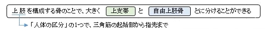上肢骨 ( じょうしこつ、 英:bones of upper limb ) 上肢骨とは 「日本人体解剖学 (上巻) 」では、以下のように人体の骨をその位置する場所によって4つのグループに分けている。上肢骨はそのうちの一つのグループになる。