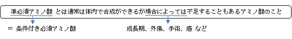 準必須アミノ酸( じゅんひっすあみのさん、英:conditionally essential amino acids ) 代 表 1 グルタミン 大代表、体内で最も多い遊離アミノ酸で骨格筋に圧倒的に存在 2 アルギニン 一酸化窒素(NO)の前駆体、血管拡張・免疫調整に関与 3 チロシン フェニルアラニンから合成される。カテコールアミンなどの前駆体 4 システイン メチオニンから合成される含硫アミノ酸でグルタチオン合成に必須 補 5 グリシン コラーゲンの主要構成成分、抑制性神経伝達にも関与 6 プロリン コラーゲン合成に重要、創傷治癒・成長期で需要増大