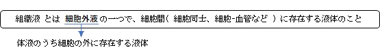 もともとは血漿成分が血圧によって毛細血管からしみでたものなので、血漿が組織液の主成分となり以下のようなものを含む。