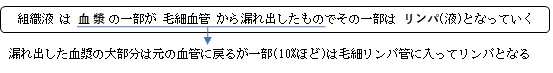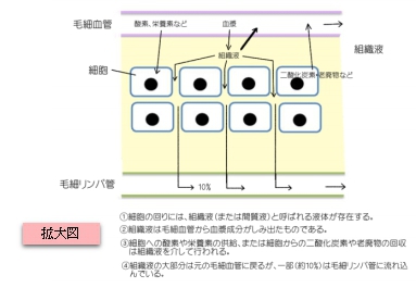 細胞の回りに存在する組織液は、その大部分(90%)は元の毛細血管に戻るが、その一部(10%)は毛細リンパ管に流れ込んでいる。