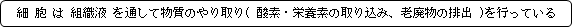 毛細血管によって運ばれた酸素や栄養素は、毛細血管から出ると組織液の中を通って細胞まで運ばれる。また、細胞内で発生した二酸化炭素や老廃物は、組織液の中を通って毛細血管に運ばれて回収される。