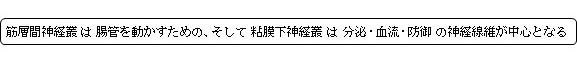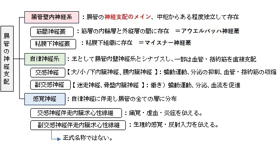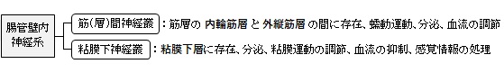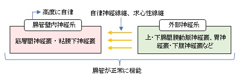 腸管壁内神経系は高度に自律した腸管独自の神経系で、中枢から完全に切り離されてもある程度機能することができる。また、外部神経からの枝の入力も受け、腸管内の筋の運動や分泌活動の調節に関与して初めて腸管が本来持つ機能が正しく作用する。